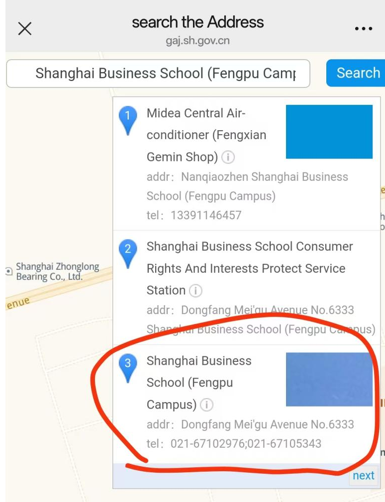 Input “Shanghai Business School (Fengpu Campus)” and choose it.