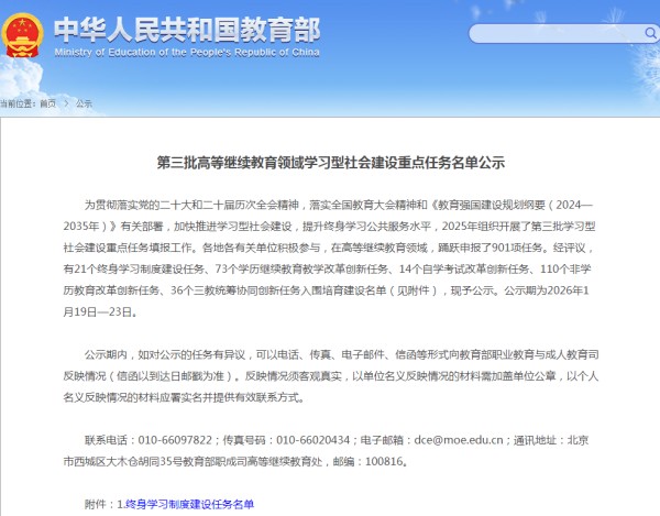 按照教育部《关于做好第三批学习型社会建设重点任务填报工作的通知》、上海市教委《关于做好第三批非学历教育改革创新任务申报工作的通知》,学校积极申报第三批学习型社会建设重点任务。经初步审核后,高校通过系统填报相关材料。上海市教委终身教育处根据任务要求对申报单位基础及建设方案组织专家评审并通过平台择优差额推荐。经教育部评议,最终有21个终身学习制度建设任务、73个学历继续教育教学改革创新任务、14个自学考试改革创新任务、110个非学历教育改革创新任务、36个三教统筹协同创新任务入围培育建设名单。