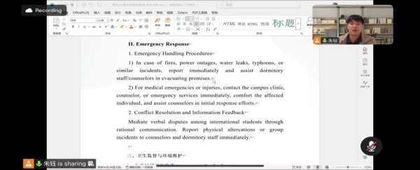 本次安全教育行动聚焦消防安全、用电安全、交通出行、网络诈骗防范等重点领域,面向全体留沪留校留学生开展线上专题安全教育。通过真实案例剖析、互动问答等形式,有效提升留学生的安全意识和应急处置能力。“安全无小事,尤其在假期”,学院坚持全覆盖、多维度推进安全教育与实地走访,确保每一位留学生在平安环境中安心学习、愉快生活。