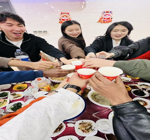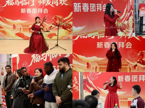 团拜会现场暖意融融,年味十足。当熟悉的旋律响起,来自不同国家的留校留学生并肩而立,倾情演唱中文经典歌曲《朋友》。他们中有人刚学会用筷子,有人已能流利用中文对话,而此刻,所有人都用同一种语言唱出:“朋友一生一起走……”歌声虽不追求技巧的完美,却因真挚而格外动人。不同肤色的面庞映衬着大红福字,异国口音的中文交织成独特的和声,将跨越山海的情谊娓娓道来。一曲唱罢,留学生用中文向在场的所有师生送上新春祝福:“春节快乐”“万事如意”——那些略显生涩却真诚无比的发音,瞬间点燃全场的掌声与欢笑。